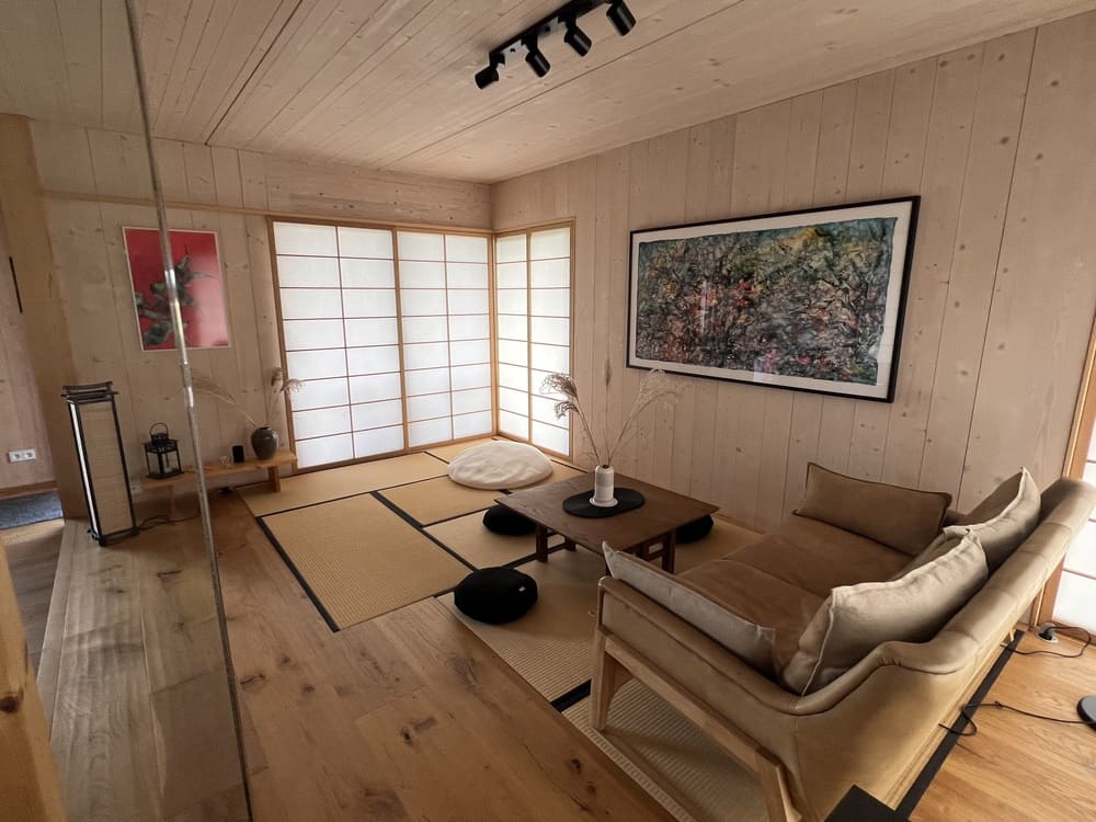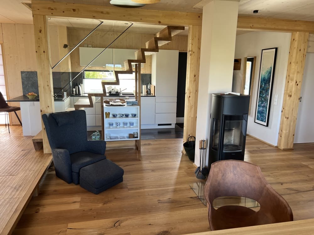 Jedes Öko-Luxus-Holzhaus verfügt neben der Küche, einer Terrasse und dem Essbereich mit Ausblick, über eine gemütliche Wohnzimmer-Ecke mit Sessel und Couch. Und je nach Bedarf können Sie auch das große Flachbild-TV nutzen.